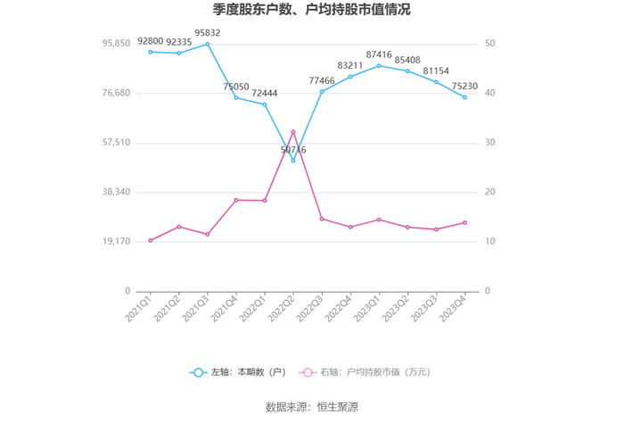 筹码集中度方面,截至2023年年末,公司股东总户数为7.52万户,较三季度末下降了5924户,降幅7.30%;户均持股市值由三季度末的12.58万元上升至13.94万元,增幅为10.81%。