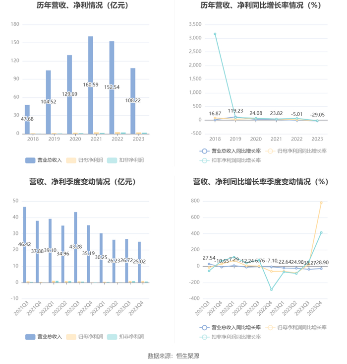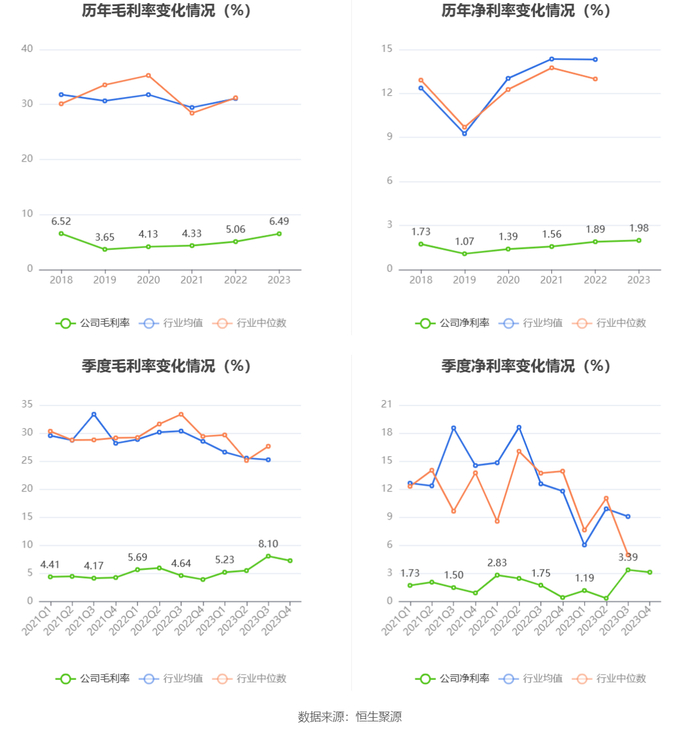 2023年,公司毛利率为6.49%,同比上升1.43个百分点;净利率为1.98%,较上年同期上升0.09个百分点。从单季度指标来看,2023年第四季度公司毛利率为7.29%,同比上升3.35个百分点,环比下降0.81个百分点;净利率为3.14%,较上年同期上升2.70个百分点,较上一季度下降0.25个百分点。