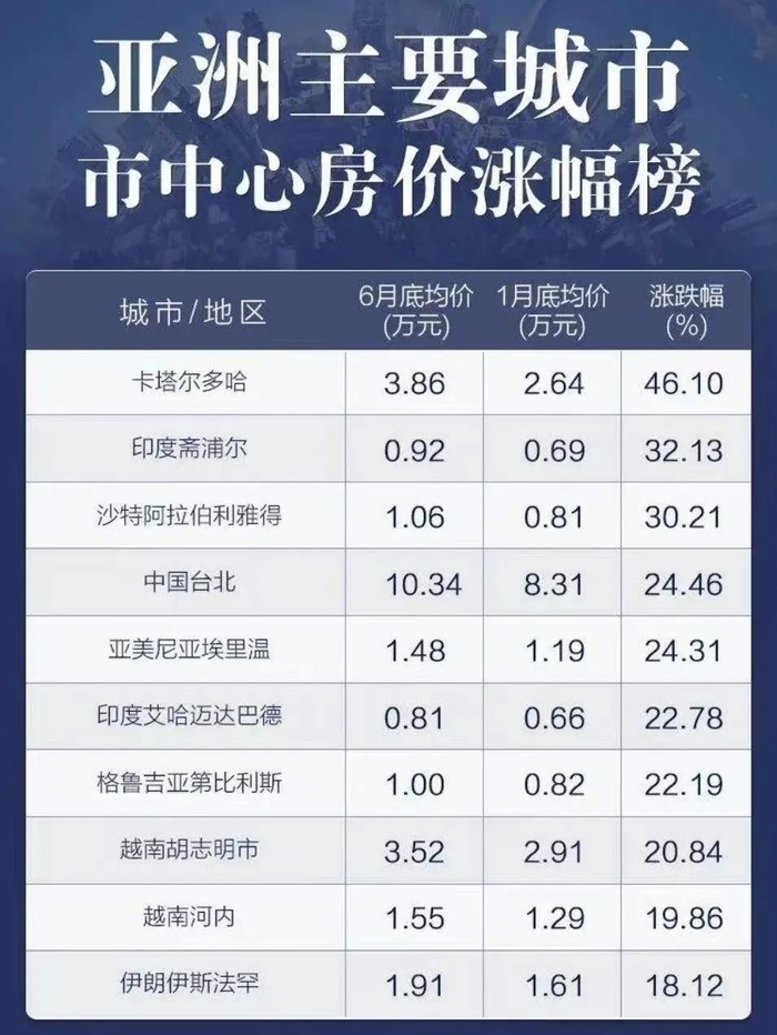在2022年上半年的亚洲主要城市房价涨幅榜TOP10上,越南上榜了两座城市,其中胡志明市在今年6月的房产均价已达到35200元人民币/平,相比1月上涨了20.84%;河内在6月的房产均价为15500元/平,对比1月也上涨了19.86%。