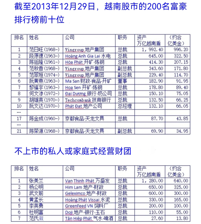在越南2006年的富豪百强榜上,前十都还只有陈金成一个华裔,但到2013年,越南富豪百强榜中,华裔已经占据半壁江山。