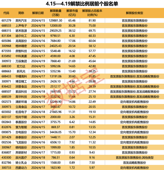 相较于市值规模,解禁比例(解禁股数量占总股本比例)更能反映出解禁对于个股股价的冲击。在上述57股中,共计26股解禁比例超过10%。英利汽车、上声电子、诺禾致源、迪尔化工、龙高股份解禁比例居前,依次为81.9%、75%、69.75%、60.33%、60.04%,解禁类型均为首发原股东限售股份。