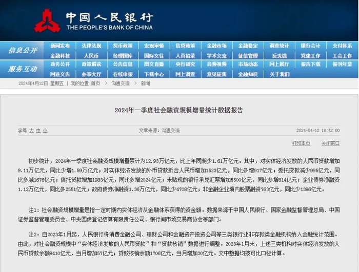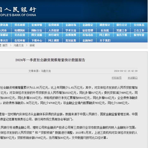 4月12日,央行发布的最新金融统计数据显示,3月末,广义货币(M2)余额304.8万亿元,同比增长8.3%。3月末,社会融资规模存量为390.32万亿元,同比增长8.7%;一季度社会融资规模增量累计为12.93万亿元。3月末,人民币贷款余额247.05万亿元,同比增长9.6%;一季度人民币贷款增加9.46万亿元。