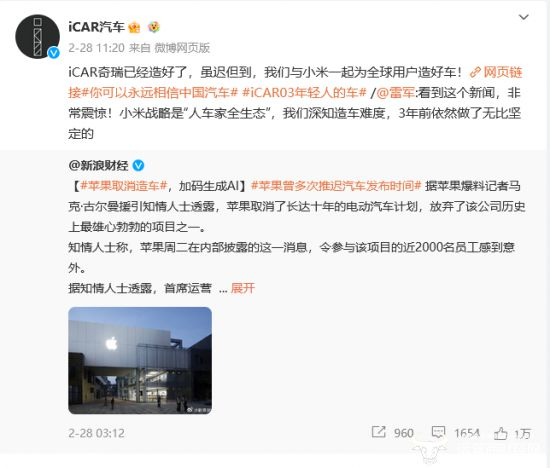 智米不等于小米,苏峻也不是小米的高管,运营商财经网注意到,iCAR汽车也有过疑似“蹭热度”行为。在iCAR V23上市之前,iCAR汽车就转发雷军微博,表示:iCAR奇瑞已经造好了,虽迟但到,我们与小米一起为全球用户造好车!
