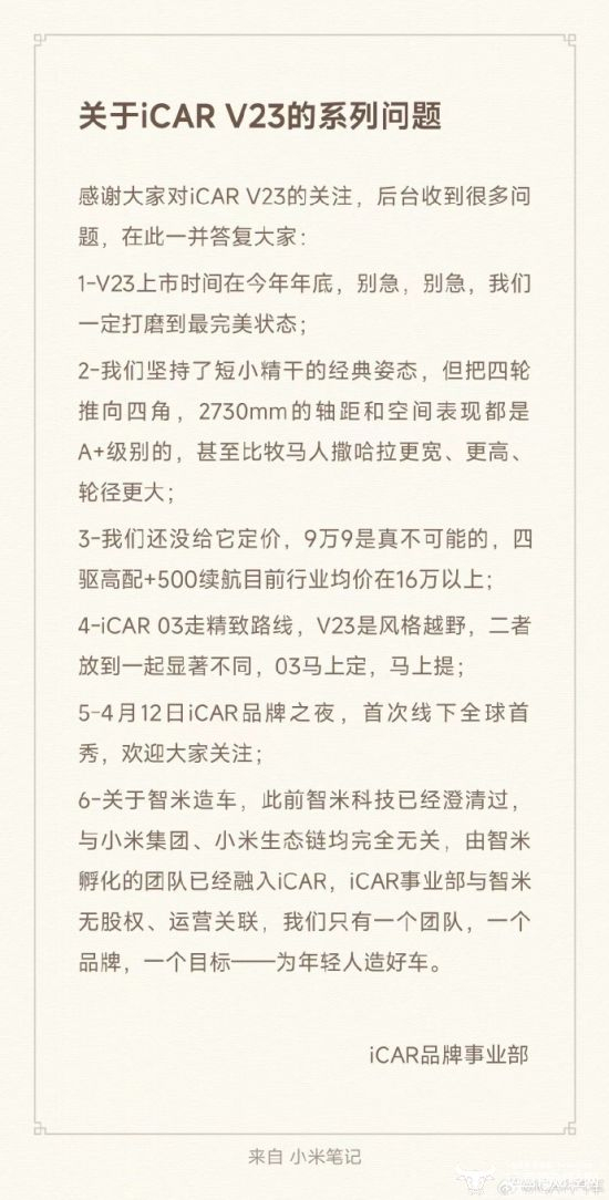 除了澄清与小米汽车的关系之外,iCAR汽车还一并回复了其他问题,如:V23将在今年年底上市;9万9的定价是不可能的等等。iCAR V23未来表现如何,运营商财经网将持续关注。
