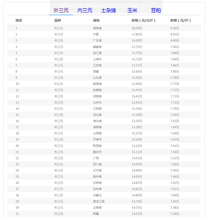 外三元排行前三:海南省18.39元/公斤、宁夏回族自治区17.86元/公斤、广东省16.00元/公斤;