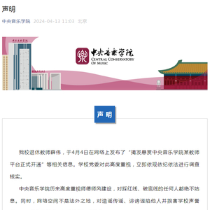 中央音乐学院历来高度重视师德师风建设,对踩红线、破底线的任何人都绝不姑息。同时,网络空间不是法外之地,对造谣传谣、诽谤诬陷他人并损害学校声誉者,中央音乐学院将依法追究其法律责任。