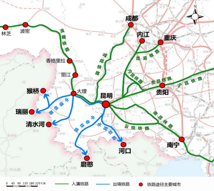 在陆域方面,昆明是泛亚铁路东线、中线和西线的共同起点,三线交汇于昆明。无论是中老中泰铁路,还是中缅通道,抑或中越铁路,昆明都是难以绕开的存在。