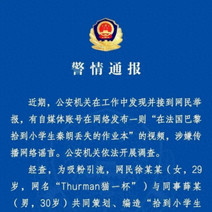 4月12日,杭州警方发布警情通报,称今年2月自媒体账号“Thurman猫一杯”(以下简称“猫一杯”)发布的“在法国巴黎拾到小学生秦朗丢失的作业本”的视频涉嫌传播网络谣言,公安机关对网红博主徐某艺、编导薛某以及涉事公司处以行政处罚。