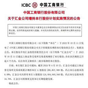 工商银行公告称,截至2024年4月10日,汇金公司通过上海证券交易所交易系统累计增持本行A股股份286,807,989股,约占本行总股本的0.08%;汇金公司共持有本行A股股份124,004,660,940股,约占本行总股本的34.79%。