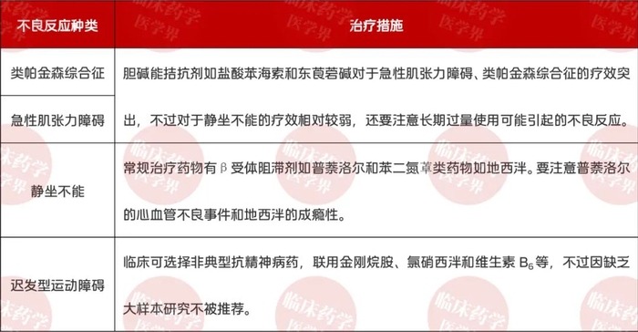4、锥体外系不良反应一旦诊断明确,患者需立即停用药物,密切观察检测下肢震颤情况;一般患者停药后不需要特殊治疗,对于比较严重的患者可给予对症治疗或使用药物对抗,如下表:
