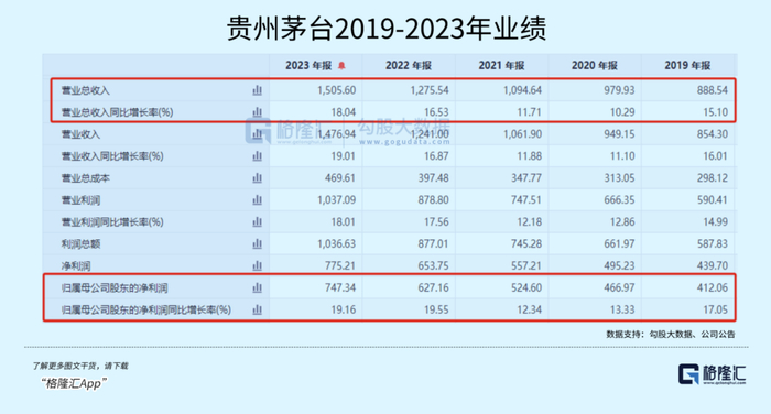 年报显示,茅台营收第一次跨入1500亿门槛,达到了1505.6亿元,增长了18.04%;净利润747.34亿元,增长19.16%,无论两者的规模还是增速,几乎已是2019年以来的最好表现了。