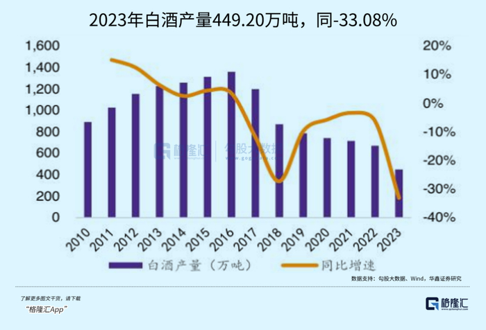 实际上,从2016年起,白酒产量缩量趋势就开始了,从最高140万千升产量降至2023年449.2万千升,2023年同比甚至骤降减了33%。
