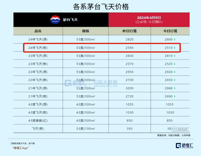 其二,最近在圈内在热烈讨论茅台飞天酒批发价持续下跌的传闻。4月9日最新价格显示,2024年53%vol500ml飞天茅台酒散瓶酒2510元,比之前下跌了150元到200元。