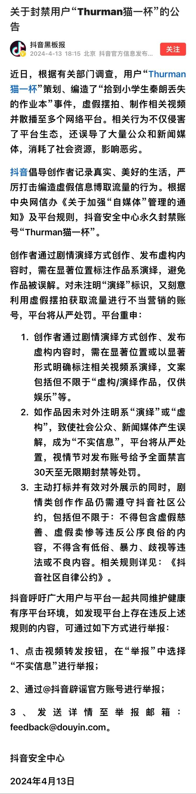 今天,抖音官方发布消息称,近日,根据有关部门调查,用户“Thurman猫一杯”策划、编造了“拾到小学生秦朗丢失的作业本”事件,虚假摆拍、制作相关视频并散播至多个网络平台。相关行为不仅侵害了平台生态,还误导了大量公众和新闻媒体,消耗了社会资源,影响恶劣。