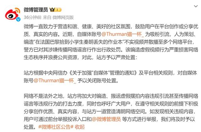 @微博管理员今天发布消息称,近期,自媒体账号@Thurman猫一杯_ 为吸粉引流,人为策划、编造“在法国巴黎拾到小学生秦朗丢失的作业本”不实视频并散播至多个网络平台,警方已对其涉嫌传播网络谣言行为作出行政处罚。该编造虚假视频行为严重损害网络生态秩序并浪费公共资源,对此,站方予以严肃处置: