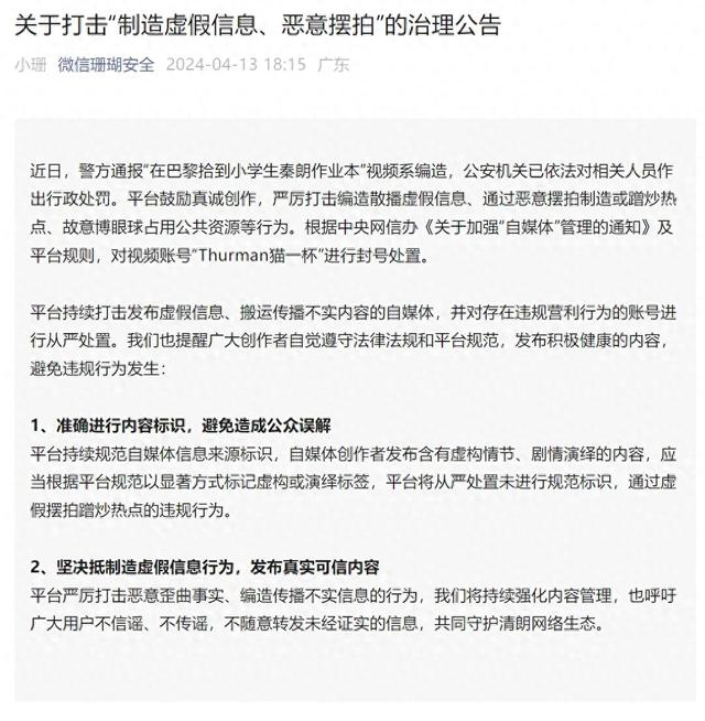 近日,警方通报“在巴黎拾到小学生秦朗作业本”视频系编造,公安机关已依法对相关人员作出行政处罚。平台鼓励真诚创作,严厉打击编造散播虚假信息、通过恶意摆拍制造或蹭炒热点、故意博眼球占用公共资源等行为。