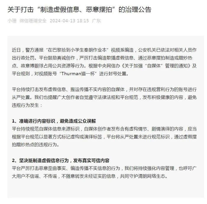 近日,警方通报“在巴黎拾到小学生秦朗作业本”视频系编造,公安机关已依法对相关人员作出行政处罚。平台鼓励真诚创作,严厉打击编造散播虚假信息、通过恶意摆拍制造或蹭炒热点、故意博眼球占用公共资源等行为。根据中央网信办《关于加强“自媒体”管理的通知》及平台规则,对视频账号“Thurman猫一杯”进行封号处置。