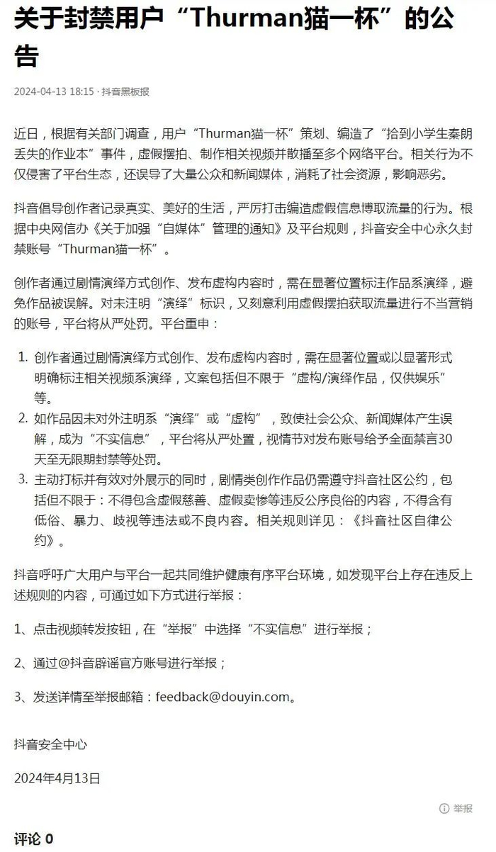 近日,根据有关部门调查,用户“Thurman猫一杯”策划、编造了“拾到小学生秦朗丢失的作业本”事件,虚假摆拍、制作相关视频并散播至多个网络平台。相关行为不仅侵害了平台生态,还误导了大量公众和新闻媒体,消耗了社会资源,影响恶劣。