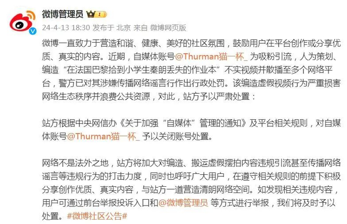 微博一直致力于营造和谐、健康、美好的社区氛围,鼓励用户在平台创作或分享优质、真实的内容。近期,自媒体账号@Thurman猫一杯_为吸粉引流,人为策划、编造“在法国巴黎拾到小学生秦朗丢失的作业本”不实视频并散播至多个网络平台,警方已对其涉嫌传播网络谣言行作出行政处罚。该编造虚假视频行为严重损害网络生态秩序并浪费公共资源,对此,站方予以严肃处置: