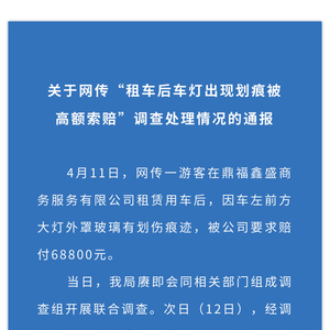 4月11日,网传一游客在鼎福鑫盛商务服务有限公司租赁用车后,因车左前方大灯外罩玻璃有划伤痕迹,被公司要求赔付68800元。当日,我局赓即会同相关部门组成调查组开展联合调查。次日(12日),经调解已由该公司退还了租车人全部押金,对调查中发现该公司未按规定办理备案从事汽车租赁服务的违法行为,依据《小微型客车租赁经营服务管理办法》有关规定,依法依规作出了行政处罚。