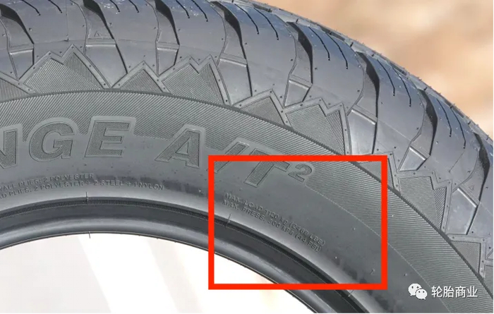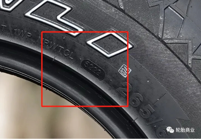轮胎生产日期一般标注在长椭圆形边框里,如:此款万力轮胎的生产日期标注为5222,则这四个数字后两位“22”代表生产年份为2022年,前两位“52”代表2022年的52周生产。值得注意的时,轮胎存放时间不宜超过3年,购买轮胎时也可以通过生产日期来查看是否是库存胎。