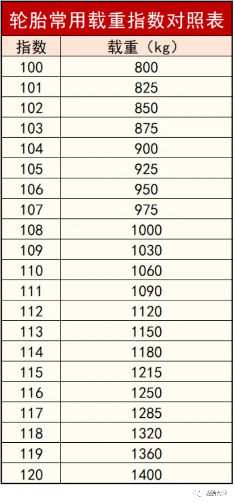 另外112代表中在指数,代表了轮胎最大能够承载的重量,一般情况下指数越大越好,下图是截取的部分常用轮胎载重指数对照表。