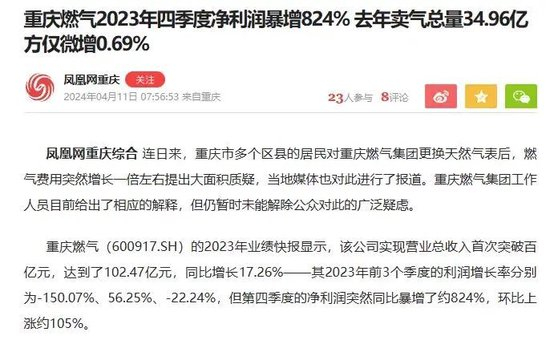 2023年第四季度,重庆燃气净利润暴增824%,可同期的卖气量只是微增了0.69%。这个数据太离谱了。在民众的一片质疑声中,重庆燃气自己回复了:“未发现存在计量失准问题。”