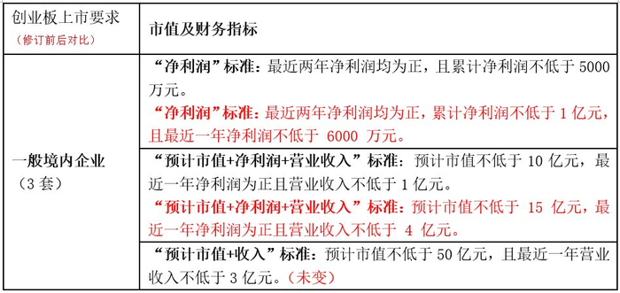 创业板突出创新创业的特色,聚焦的成长性等指标,为此设置了3条上市标准(一般境内企业),另外,针对红筹架构、存在表决权差异安排的企业设置了2套上市标准。