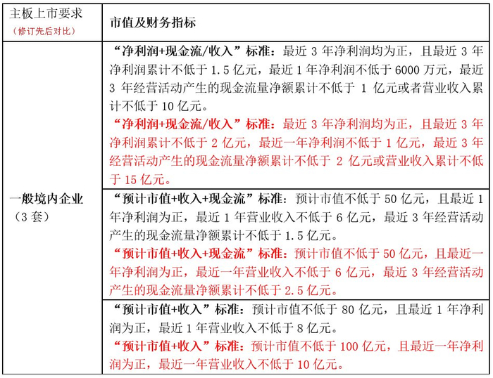 修订之前,主板(一般境内企业)设置了3套上市标准。除了一般境内企业外,还针对已在境外上市的红筹企业设置了2套上市标准、未在境外上市的红筹企业设置了3套上市标准、存在表决权差异安排的企业设置了2套标准。