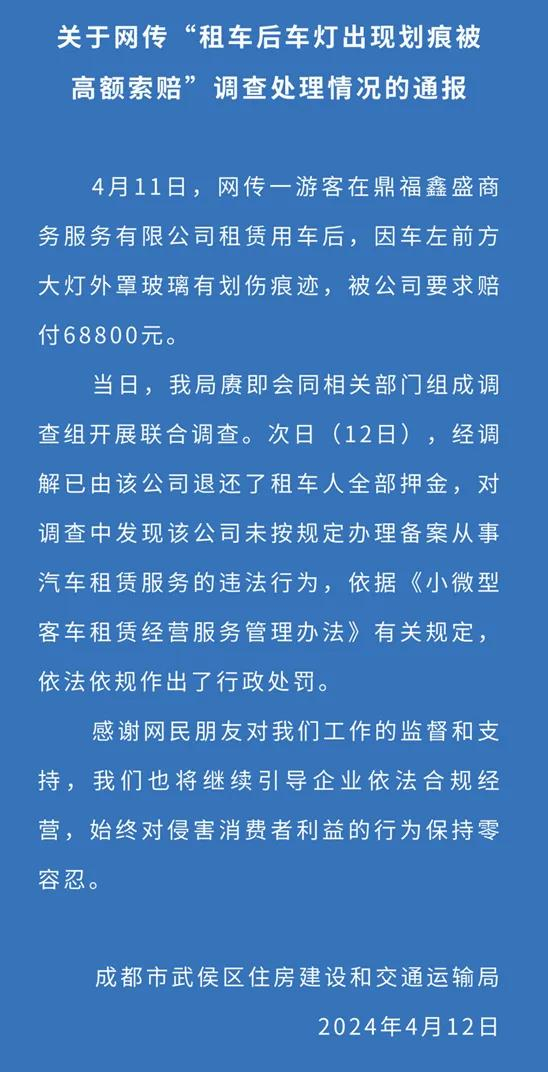 4月12日,四川成都武侯区住建交局发布关于网传“租车后车灯出现划痕被高额索赔”调查处理情况的通报。详情如下: