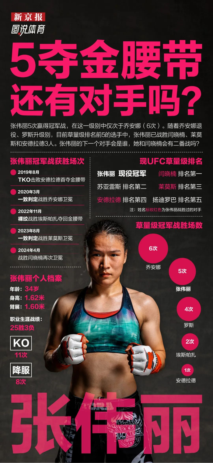 从2019年首次夺冠至今,张伟丽已经赢了5场世界冠军战。无论是面对乔安娜、罗斯、莱莫斯还是闫晓楠,张伟丽从来都把自己放在挑战者的位置,“当八角笼的大门关上时,我也是一个挑战者。”在张伟丽看来,她和闫晓楠都是挑战者,这条腰带是有待争夺的,任何格斗选手都可以尝试得到它。