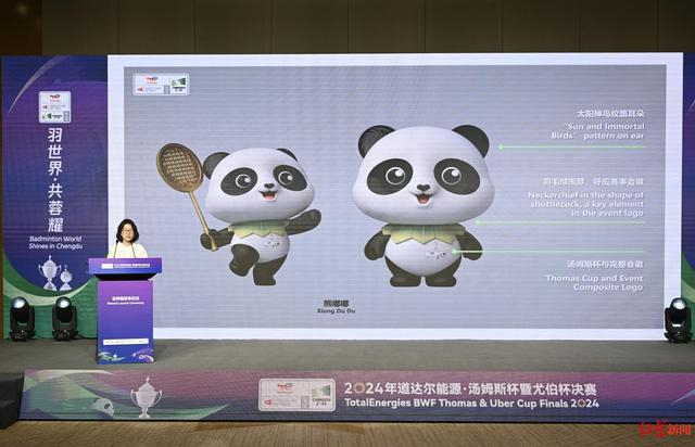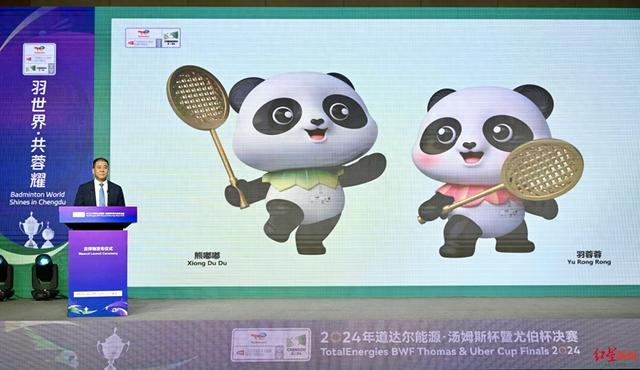 4月14日,2024年道达尔能源·汤姆斯杯暨尤伯杯(以下简称成都2024汤尤杯)决赛吉祥物发布仪式在四川传媒大厦多功能厅举行,两大吉祥物“熊嘟嘟”和“羽蓉蓉”首次公开亮相。