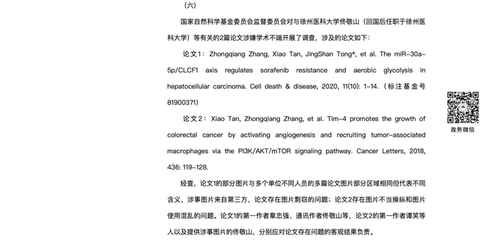 国家自然科学基金委员会监督委员会对与徐州医科大学佟敬山(回国后任职于徐州医科大学)等有关的2篇论文涉嫌学术不端开展了调查,涉及的论文如下: