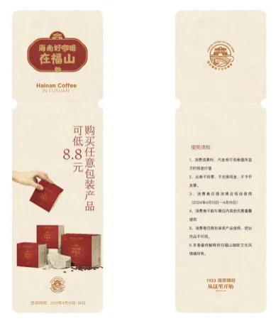 4、消博会现场派送福山咖啡文化风情镇现金券8.8元(仅限消博会现场使用,不与展位内其他优惠重叠使用,不可兑换现金,仅限包装类产品使用,吧台饮品不可用)