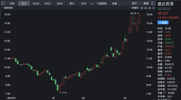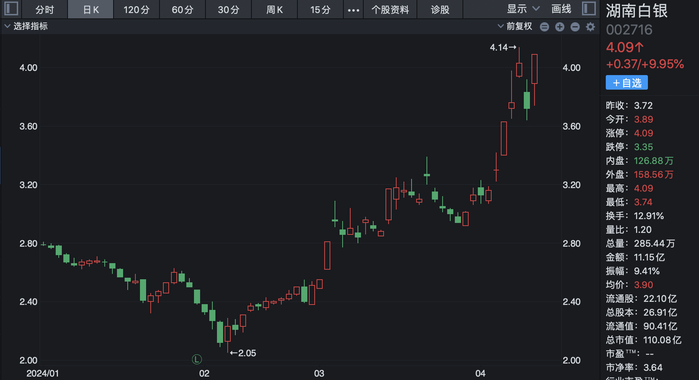 二级市场上,湖南白银披露上述公告次日股价收盘涨停,本周三证券简称正式变更,当日盘中股价触及涨停。在贵金属板块中,湖南白银股价4月以来累计涨幅位列前三,超过赤峰黄金、山东黄金、四川黄金等黄金股。