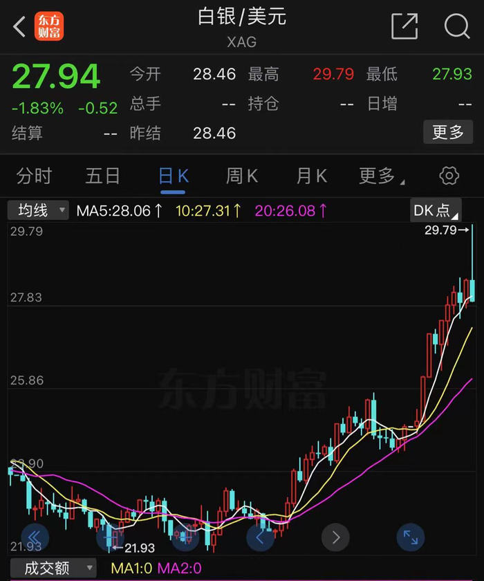 财联社4月14日讯(编辑 俞琪)随着现货黄金价格屡创历史新高,同属于贵金属的白银价格也正加速狂飙。沪银期货主力合约周五最高触及7790元/千克,创下历史新高;与此同时,现货白银价格盘中最高触及29.79美元/盎司的近三年来新高。二级市场方面,湖南白银和盛达资源周五收盘均涨停,兴业银锡盘中最高涨近7%。