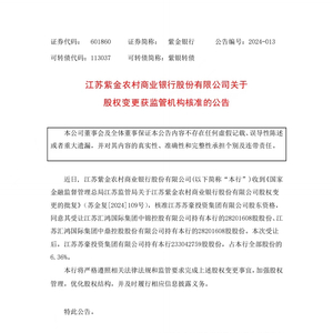 紫金银行在公告中称,本行收到《国家金融监督管理总局江苏监管局关于江苏紫金农村商业银行股份有限公司股权变更的批复》(苏金复[2024]109号),核准江苏苏豪投资集团有限公司股东资格,同意其受让江苏汇鸿国际集团中锦控股有限公司持有本行的28201608股股份、江苏汇鸿国际集团中鼎控股股份有限公司持有本行的28201608股股份。
