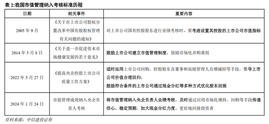 2)进一步研究将市值管理纳入央企负责人考核标准:我国市值管理的概念最初是在2005年提出,国资委在2005年9月发布的《关于在上市公司股权分置改革中国有股股权管理有关问题的通知》中,首次明确提出将市值纳入考核体系;2014年5月8日,国务院发布的《关于进一步促进资本市场健康发展的若干意见》中,提出发展多层次股票市场、提高上市公司质量,并鼓励上市公司建立市值管理制度,树立了市值管理在中国资本市场的重要位置;2022年5月27日,国资委发布的《提高央企控股上市公司质量工作方案》中提出,鼓励中央企业探索将价值实现因素纳入上市公司绩效评价体系,建立长效化、差异化考核机制,引导上市公司依法合规、科学合理推动市场价值实现,表明国家持续推动将市值管理纳入央企考核标准。近日国资委再次传递出“深化市值管理纳入考核标准”的信号,代表国家对市值管理纳入考核的态度从“鼓励、支持”转变为“深入、要求”,从而进一步推动央企改革。