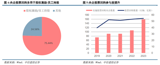 4)增持、回购手段传递信心,稳定预期:股票回购的核心目的是稳定股价,大多数与股权激励、员工持股相结合,且作为上市公司维稳股价的手段之一,回购增持有利于想市场传递积极向好的情绪,彰显市场对于经济复苏的信心。此番将市值管理纳入中央负责人业绩考核,是国家对稳定央企股价的有力手段,进一步维稳市场走势,有立竿见影的护盘效果。而通过增持、回购等市场化手段,不仅可以维稳股价走势,更预示着中央负责人对企业的信心,而央企的市值占比较高,其股价的企稳可以熨平股市情绪,具备一定的带头作用。回购后的股权激励/员工持股更可以进一步将员工利益与企业挂钩,激励企业盈利能力走高,稳定了企业预期。