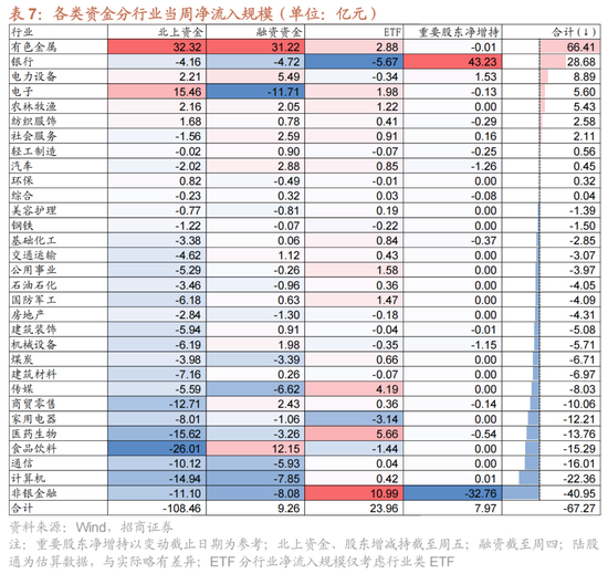 【资金·众寡】北上净流出融资净流入,ETF净申购。北上资金本周净流出114.7亿元;融资资金前四个交易日合计净流入9.5亿元;新成立偏股类公募基金10.5亿份,较前期下降11.1亿份;ETF净申购,对应净流出39.0亿元。行业偏好上,北上资金净买入规模较高的为有色金属、电子、电力设备等;融资资金净买入有色金属、食品饮料、电力设备等;券商ETF申购较多,金融地产(不含券商)ETF赎回较多。重要股东由净减持转为净增持,计划减持规模下降。