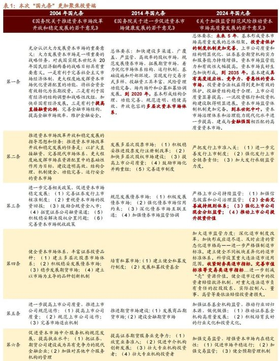 我们回顾了2004年、2014年“国九条”颁布的背景、政策细则以及市场演绎情况发现,历次“国九条”出台后,都对后续市场表现起到了极大的提振作用。2004年“国九条”颁布后的两个月,市场迎来普涨。2014年“国九条”颁布后,2014年1月到2015年6月期间,A股市场经历了从结构牛到整体牛的演绎,迎来了继1999-2001年、2005-2007年后的又一轮大牛市。