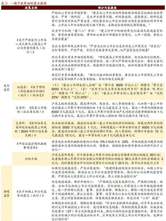 与以往更加聚焦“融资端”不同,本次“国九条”更加强调以投资者为中心,充分肯定了资本市场的投资性、以及财富管理属性。从政策细则来看,结合近期发布的“1+N”套政策体系分析,新“国九条”下,以下四个方向需要重点关注:(1)在发行监管上,提高主板、创业板、科创板的上市公司标准,严抓突击式分红;(2)在上市公司持续监管上:规范减持、采用ST警示等方式提高分红,增加上市公司的可投资性,A股整体分红比例有望提高;(3)在退市监管上:加大淘汰力度,促进A股的“新陈代谢”,退市公司数量或将上升;(4)在 交易监管上:增加高频交易的交易成本。