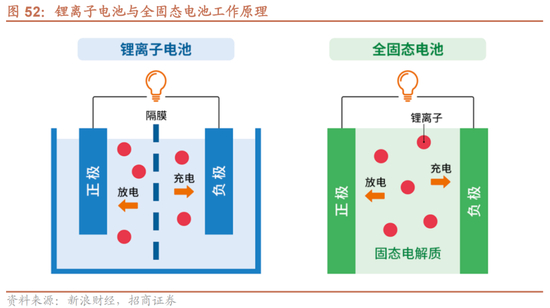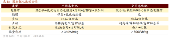 固态电池使用固体电解质,提高电池的安全性及能量密度。固态电池是一种使用固体电极和固体电解质的电池,其结构主要由正极、负极和固态电解质三个部分组成。其中,正极材料通常采用氧化物、硫化物或硒化物等复杂化合物,负极材料通常采用金属锂或碳材料,而固态电解质则采用氧化物或硫化物等固体材料。与液态电池相比,固态电池使用不可燃、无腐蚀、不挥发、不漏液的电解质,克服了传统液态电池的电解液泄漏、电极短路等现象,降低了热失控现象的发生概率,具有较高的安全性。此外,固态电池还拥有更高的能量密度。根据固态电解质用量,固态电池可分为半固态电池和全固态电池。通常情况下,液体质量占比低于10wt%的电池是半固态电池,能量密度高于350Wh/kg;液体质量占比降为0wt%的电池是全固态电池,能量密度高于500Wh/kg。