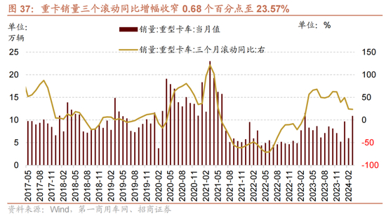3月重卡销量同比降幅收窄。根据第一商用车网数据,2024年3月我国重卡市场销售约10.9万辆(企业开票口径),环比2024年2月上涨82%,同比降幅收窄16.96个百分点至-5.56%,三个滚动同比增幅收窄0.68个百分点至23.57%。