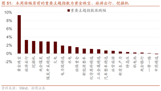 本周A股主要指数普跌,万得全A指数下跌2.73%,沪深300指数下跌2.58%,创业板指下跌4.21%。A股涨幅居前的重要主题指数为黄金珠宝、旅游出行、挖掘机。