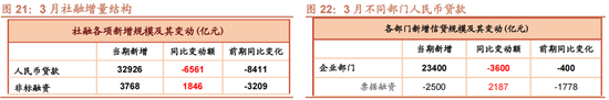 3月新增社融和人民币信贷均同比明显少增,一定程度显示融资需求整体偏弱,叠加高基数,社融增速继续回落。3月新增社融4.87万亿,同比少增5142亿元;新增人民币信贷3.09万亿,同比少增8000亿元。社融存量增速8.7%,较前期下降0.3%;新增社融6个月滚动同比增速2.22%,较前期进一步回落6.78%。
