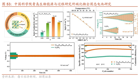 固态电池三大主流技术路线,硫化物电解质研究取得突破。固态电池的不同技术路线主要由不同的固态电解质进行区分,主要有三大技术路线:聚合物电解质、氧化物电解质、硫化物电解质。其中,聚合物电解质属于有机电解质,氧化物电解质和硫化物电解质属于无机电解质。2024年4月10日,中国科学院青岛生物能源与过程研究所在研究硫化物电解质方面取得了新进展,解决了硫化物全固态电池叠层工艺的行业痛点及瓶颈问题,打通了硫化物全固态电池的大型车载电池制作工艺的最后一道难关,在硫化物软包电池叠片技术上取得关键性突破。目前,研究所搭建了全固态电池小试制备线,研制的高电压、长寿命软包全固态锂离子电池在常温0.5C倍率下循环1000次循环,容量保持92%(丰田公司设定标准1500次循环,容量保持80%)。同时,研究所正在进行20Ah硫化物全固态电池成型生产线落地筹备工作,预期2026年率先实现硫化物全固态电池批量化生产。