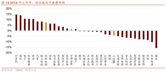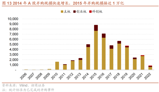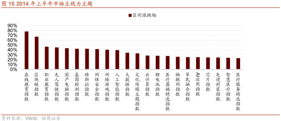 2014年1-6月:指数盘整,概念占优。蓝筹股在这个阶段持续表现较差,上证50在这个阶段下跌4%左右。在经历2013年上半年传媒互联网行情和2013年下半年板块补涨后,2014年上半年概念占优成为了市场的主要特征,典型的如在线教育、区块链、无人驾驶、网络安全等主题在整个创业板的盘整期涨幅在50%左右。概念占优的行情一方面是2013年创业板牛市特征的延续,另一方面,前面提到的并购重组规模的大幅增加功不可没。