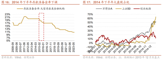 从2014年7月开始,大盘股的表现开始占优,主受流动性宽松以及开放预期的刺激。具体来看,进入2014年下半年,流动性开始改善,存款准备金率多次下调。此外,政府也在积极寻找海外的经济动能。在流动性宽松和开放预期的刺激下,很多中字头的公司底部放量、连续涨停,上证50半年涨幅59%,大盘股表现占优。