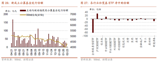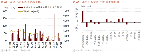 从ETF净申购来看,ETF净申购,宽指ETF申赎参半,其中科创50ETF申购较多,沪深300ETF赎回较多;行业ETF申赎参半,其中券商ETF申购较多,金融地产(不含券商)ETF赎回较多。具体来看,股票型ETF总体净申购42.9亿份。其中,沪深300、创业板ETF、中证500ETF、上证50ETF、双创50ETF和科创50ETF分别净赎回17.3亿份、净申购7.9亿份、净赎回5.8亿份、净赎回5.8亿份、净申购0.3亿份、净申购11.5亿份。行业方面,信息技术ETF净申购3.6亿份;消费ETF净赎回2.8亿份;医药ETF净申购14.1亿份;券商ETF净申购15.0亿份;金融地产ETF净赎回7.7亿份;军工ETF净申购2.0亿份;原材料ETF净赎回1.3亿份;新能源&智能汽车ETF净申购0.8亿份。